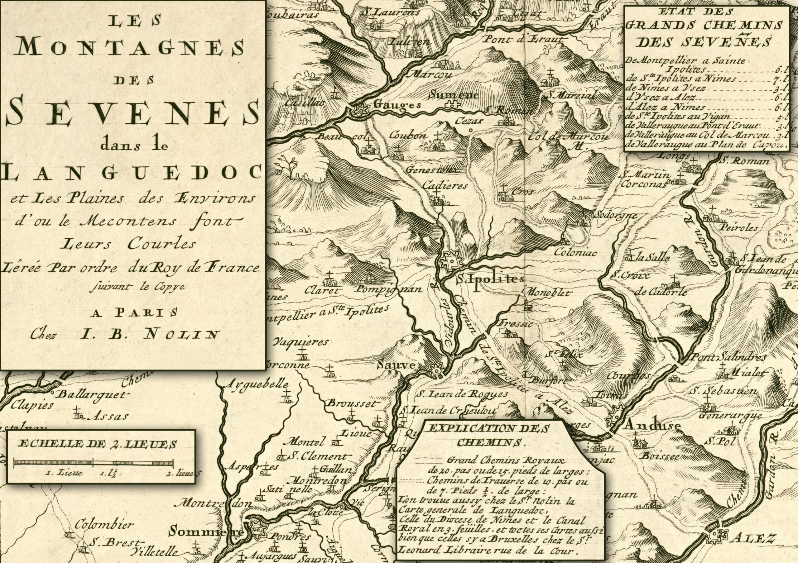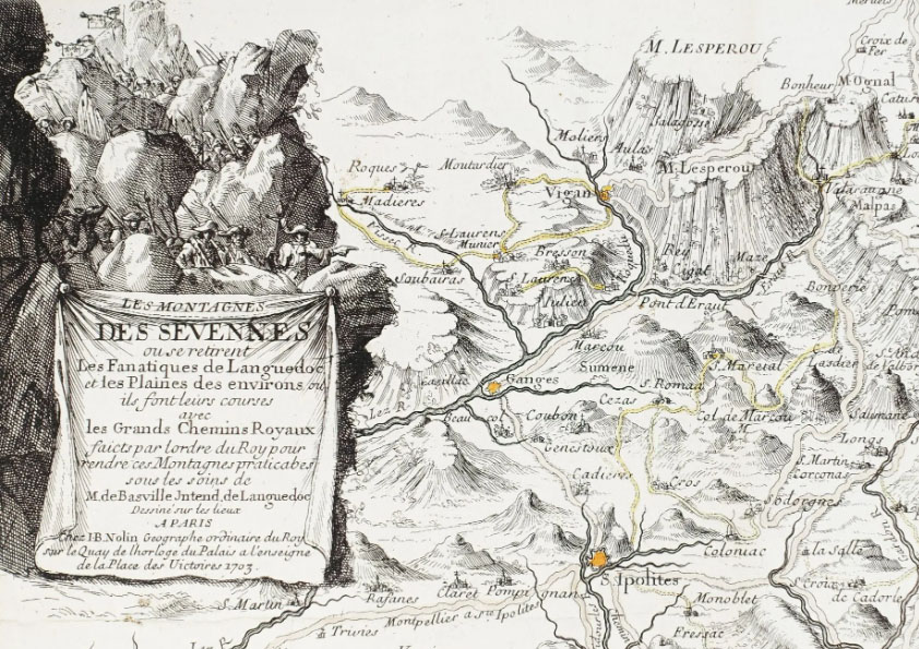 Suite à la révocation de l’Edit de Nantes en 1685, l’intendant du roi Louis XIV, Nicolas de Lamoignon de Basville, fait réaliser 22 chemins royaux. A lire le cartouche illustré du plan de ceux-ci, on comprend que ces chemins étaient ouvertement destinés à amener un peu d’ordre dans les Sevenes, où les fanatiques (1) et autres mécontens (1) ne descendaient des montagnes que pour faire leurs courses (2).