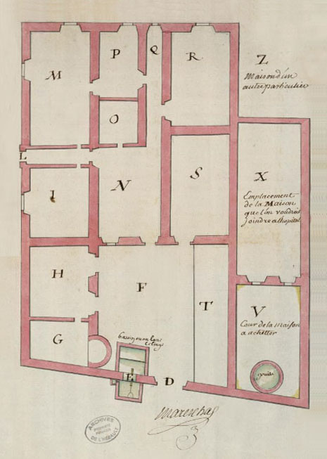 Revenons-en au bâtiment. À voir la largeur des couloirs de l’hôpital, le manque de logique au niveau des enfilades, et les annotations des architectes suggérant le rachat d’espaces voisins (V et X ne sont pas encore intégrés dans le projet), on comprend qu’on a affaire à une réhabilitation lourde. En d’autres mots, qu’il y avait au préalable une bâtisse existante avec, potentiellement, déjà une, voire deux fontaines.