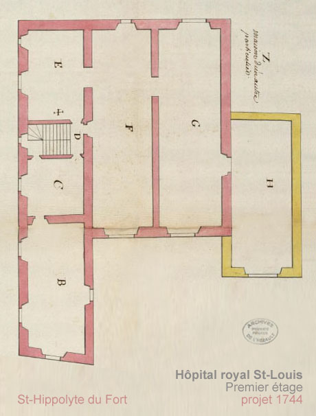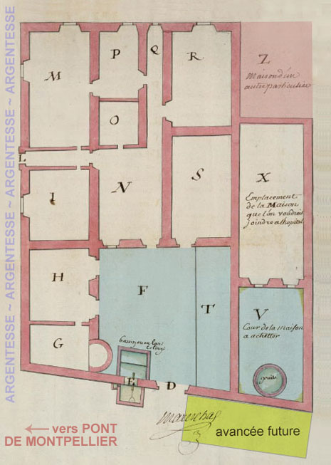 À regarder l’étude de faisabilité de 1744, portant sur l’hôpital royal St-Louis, on comprend que la fontaine extérieure a été déplacée, non pas une fois mais deux.