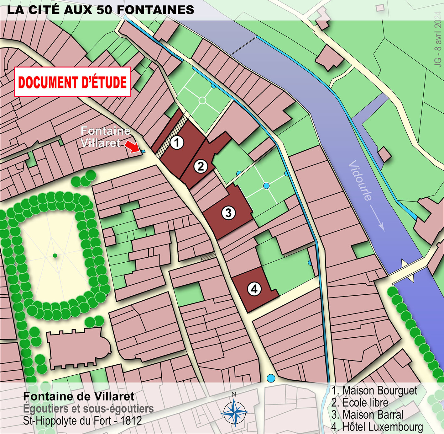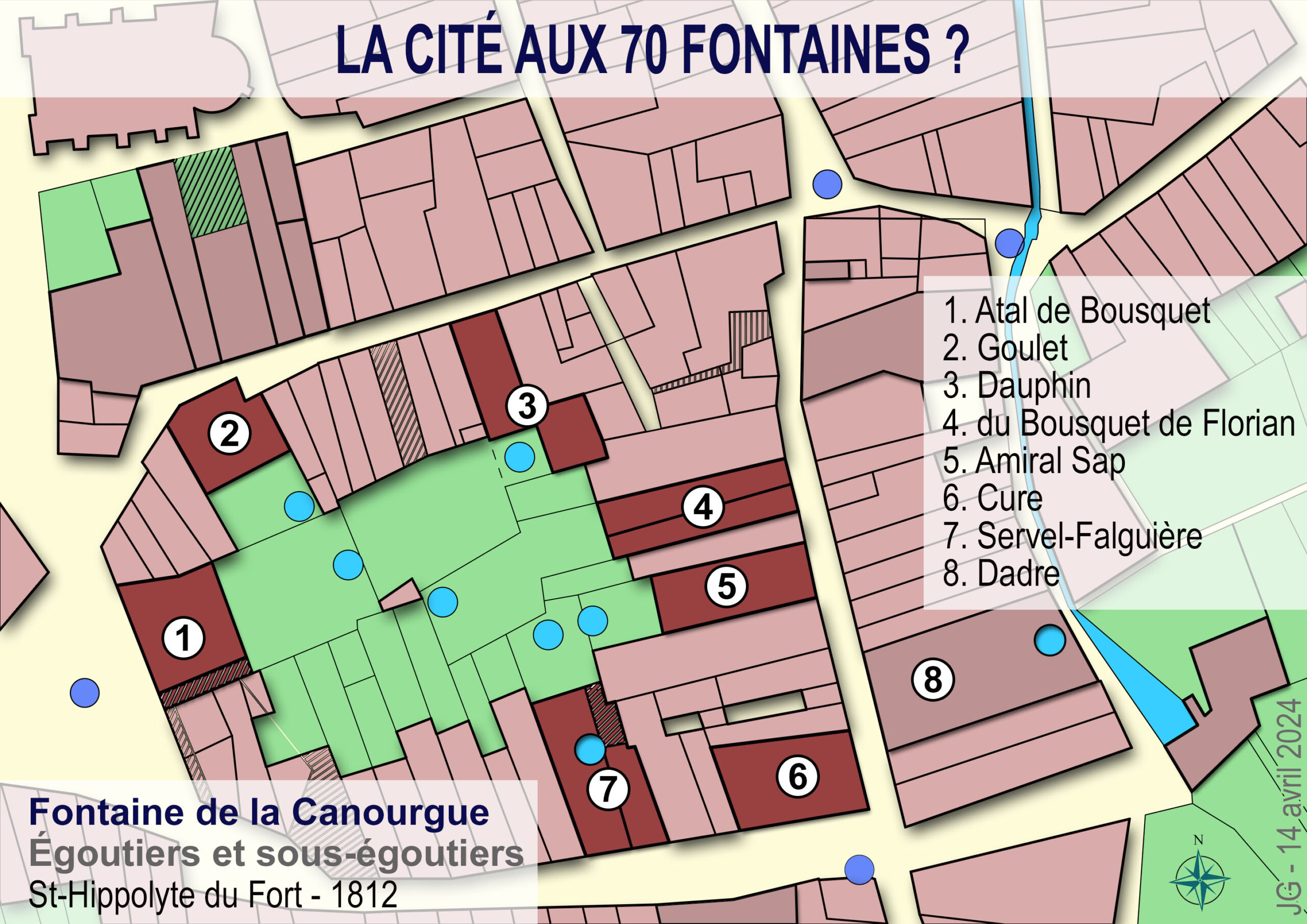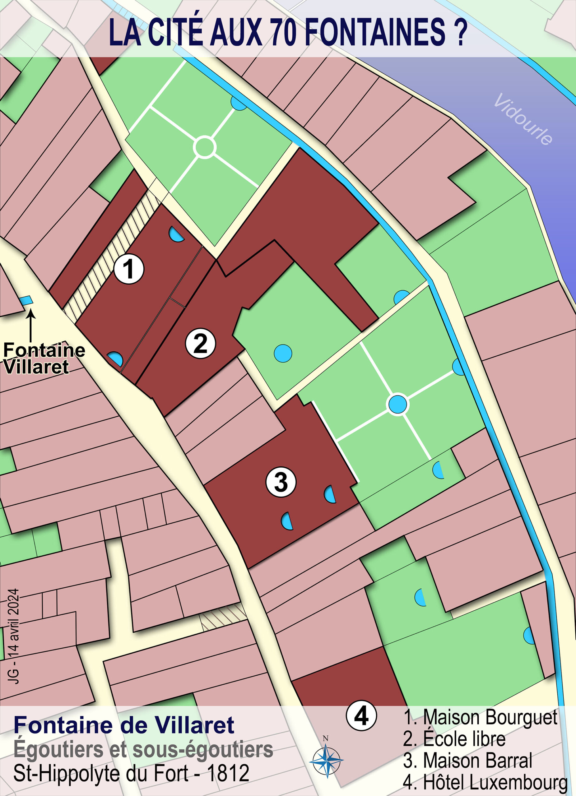 Deux îlots semblent particulièrement riches en fontaines privatives. C’est celui où se trouve la Maison Bourguet et celui des principaux égoutiers de la fontaine de la Canourgue [3]. Ce ne sont toutefois là que les deux seules zones que j’ai commencé à esquisser.