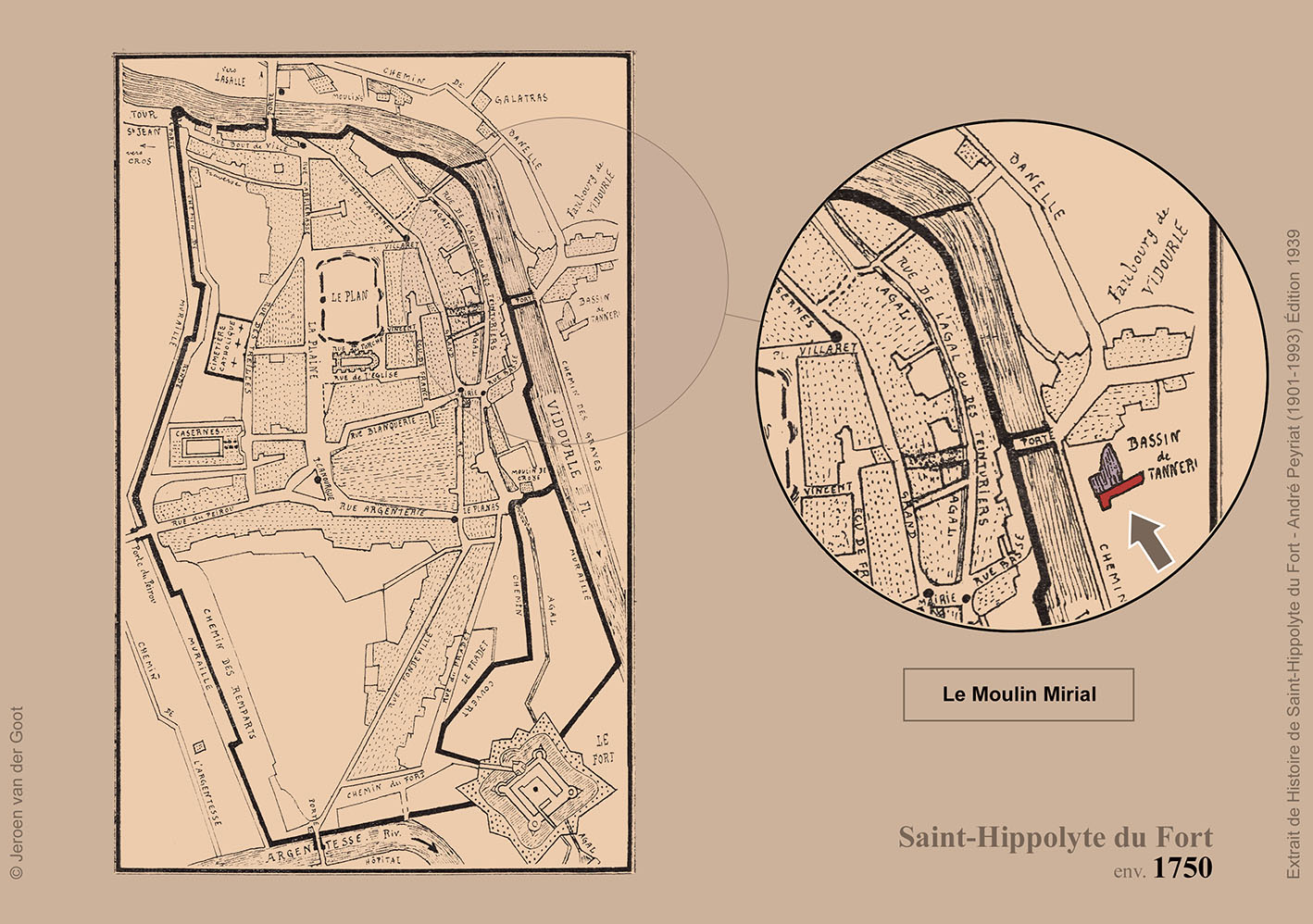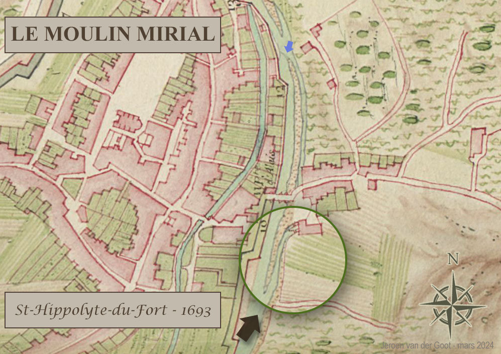 Au droit du Moulin Mirial, se trouvait un gué important, raccordant la Rue Basse et la route vers Monoblet-Anduze ; c’est-à-dire l’actuelle ruelle qui traverse le faubourg de Vidourle, la Route d’Alès n’existant pas encore.