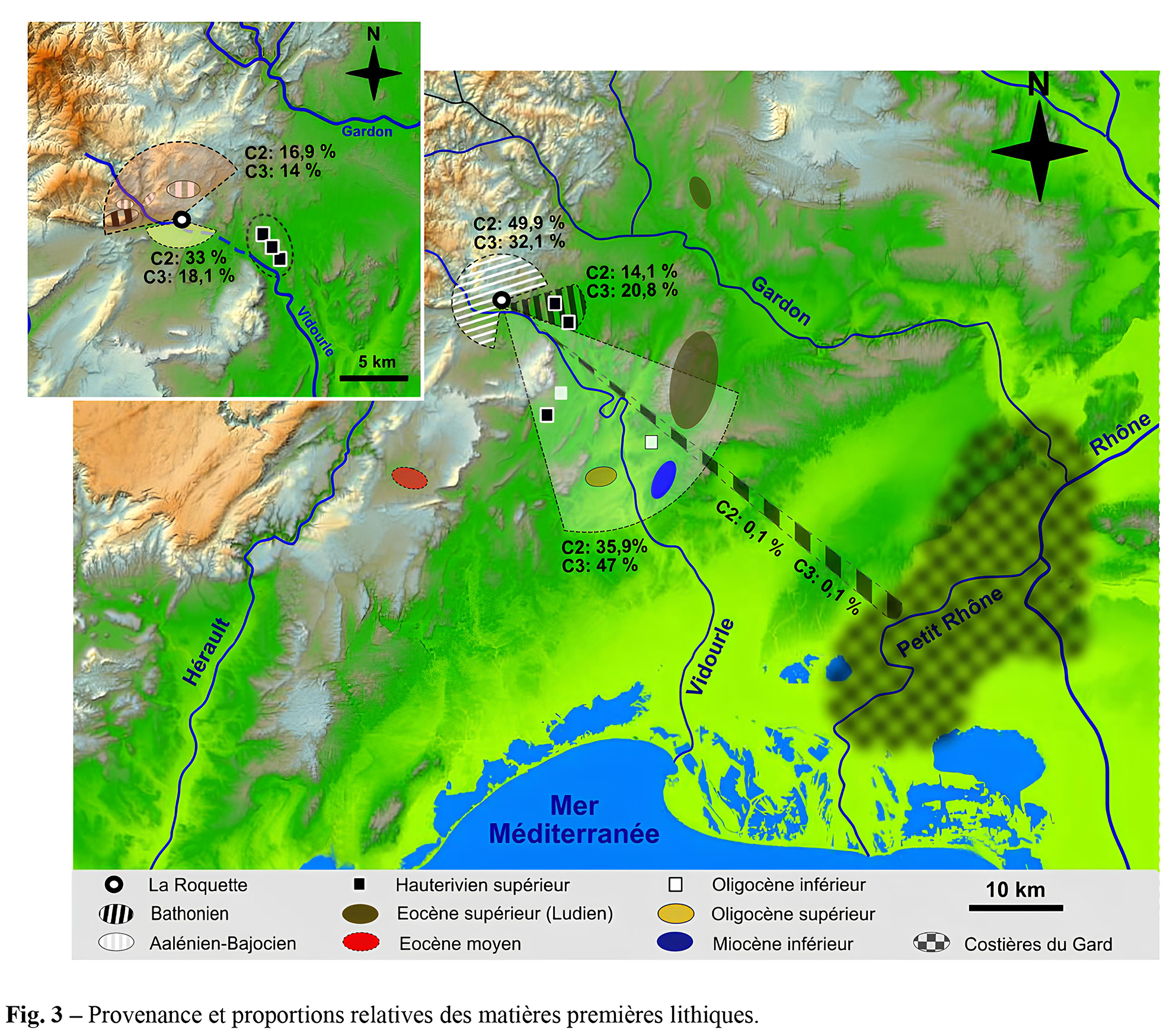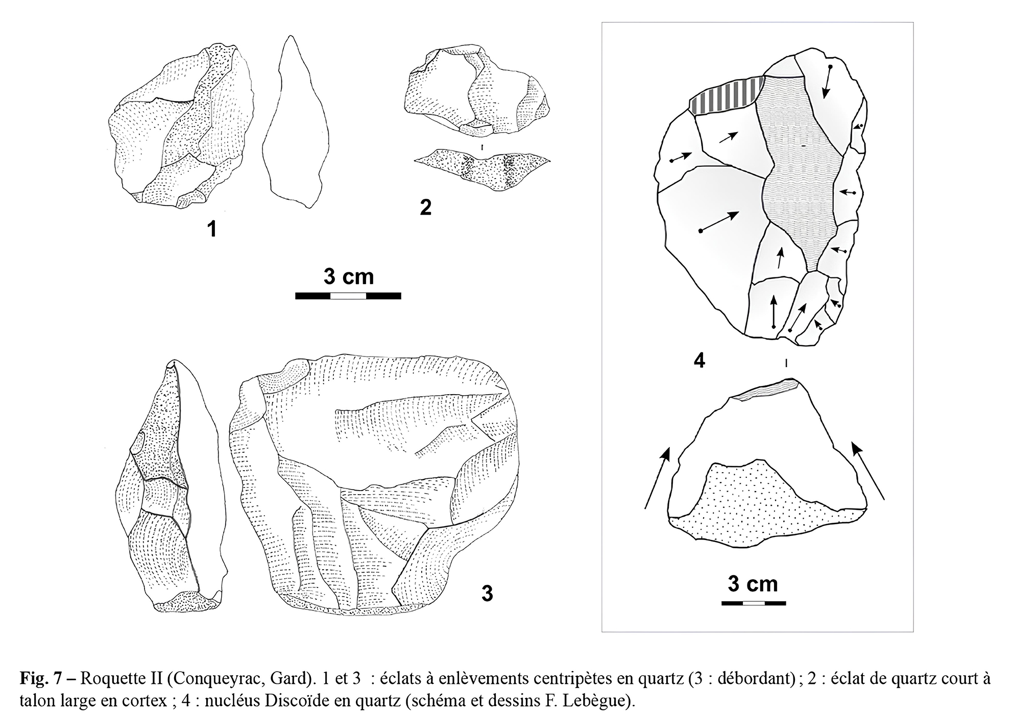 – Source principale : Frédéric LEBÈGUE & Liliane MEIGNEN, « Une halte moustérienne sous le château de La Roquette (Conqueyrac, Gard) » Bulletin de la Société préhistorique française, 2014, tome 111, n°3, p. 537–541.