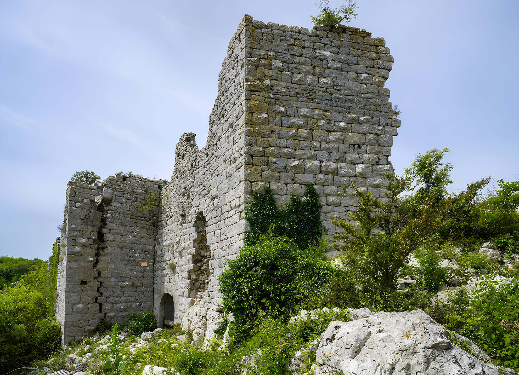 La grotte, discrète, parle d’une humanité nomade, attentive au paysage. Le château, lui, évoque une époque de conflits religieux et de luttes de pouvoir. Construit au Moyen Âge sur un promontoire rocheux, peut-être en même temps que l’enceinte du Castellas ou les fortins des Jumelles, il fut remanié à la Renaissance pour gagner en confort, avant d’être transformé en domaine agricole aux XVIIIᵉ et XIXᵉ siècles.
