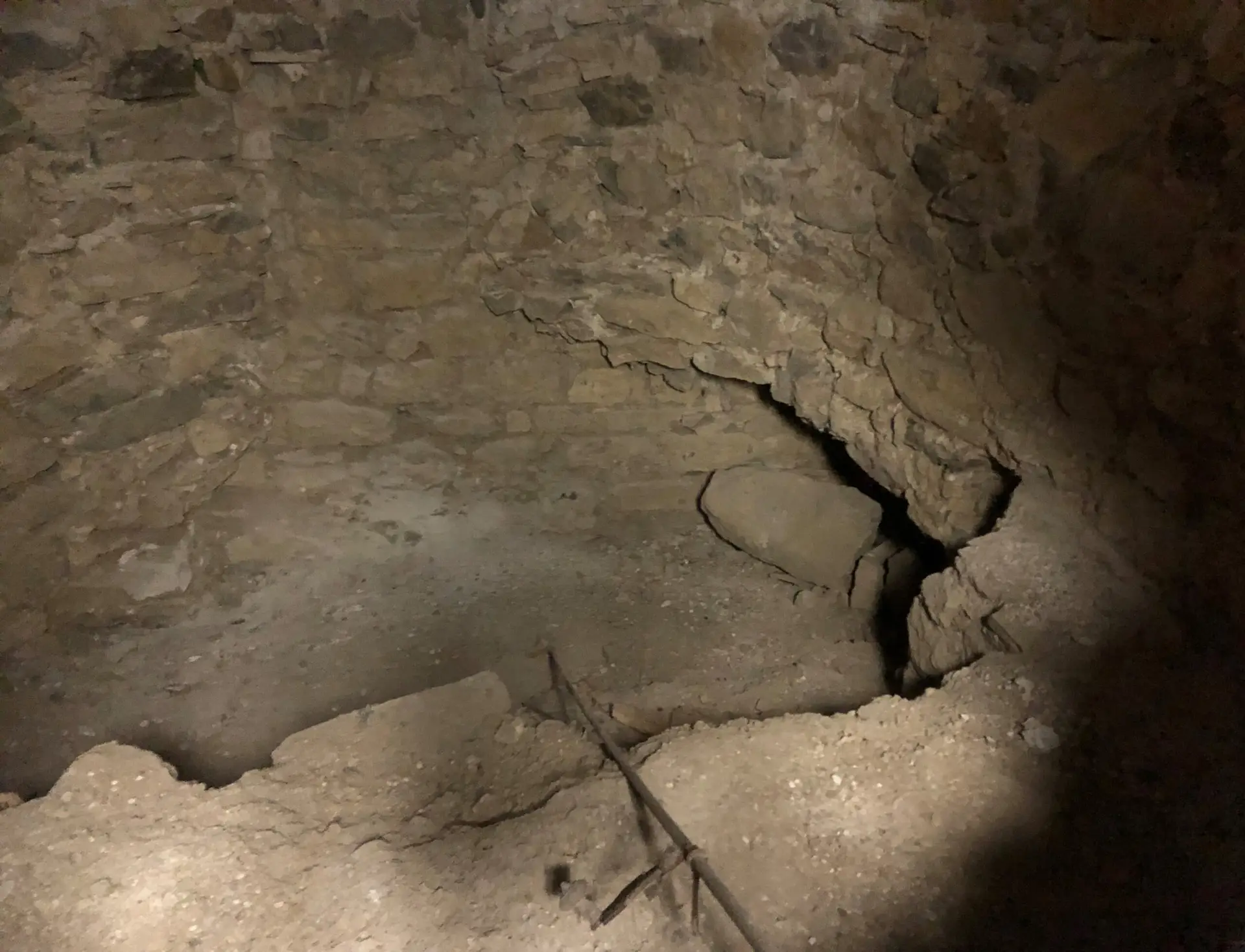En visitant les caves, j’ai trouvé les vestiges d’une tour d’environ 6 mètres de diamètre. Avec une ouverture, considérablement enterrée. Celle-ci pourrait correspondre à un souterrain allant, d’un côté, vers la tour St-Jean et, de l’autre, a priori vers le fort, en passant par le tribunal. Ce dernier s’est écroulé et, depuis, laisse la place libre au petit parking situé en-face du 26 rue Cap de ville.