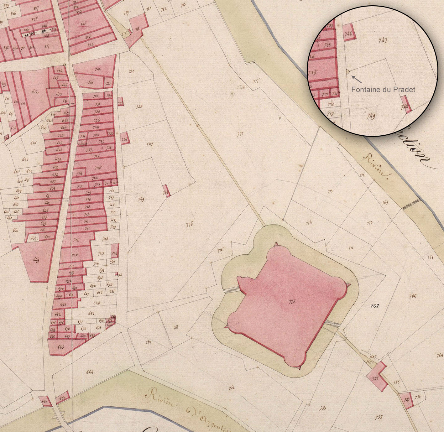 À regarder le cadastre de 1812, on peine à penser qu’il pouvait y avoir un édifice aussi monumental que celui en place aujourd’hui et, par ailleurs en saillie, le long du cours du Pradet.